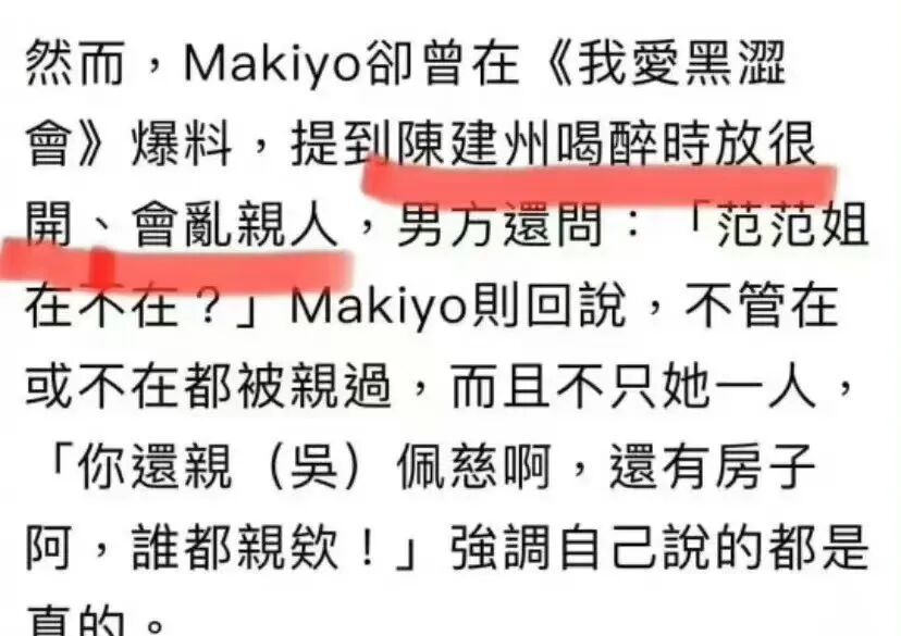 “七仙女”闺蜜团成员Makiyo曾经在节目中说陈建州喝醉时放很开,会乱亲人,即使范玮琪在场也不管。