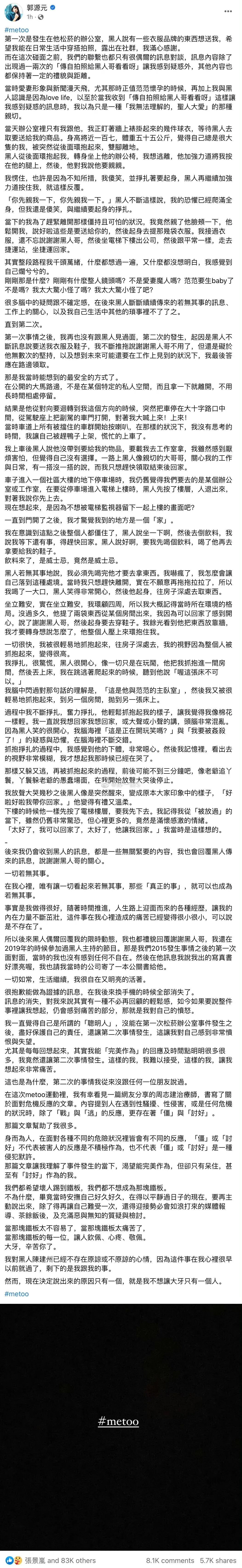 在黑人与范范起诉大牙的当天,艺人郭源元发长文声援大牙,称在范玮琪怀孕期间,受到黑人的性骚扰。