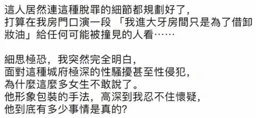 台湾省metoo运动如火如荼,6月27号,艺人大牙(周宜霈)回顾2012年随黑人一起去香港演出,当时是她老板的陈建州在大巴上开始言语骚扰。到目的地后又去大牙的房间要帮她“放松一下”;在大牙坚持拒绝的情况下,依然搂抱对方,甚至要女生亲自己的嘴巴才肯离去。
