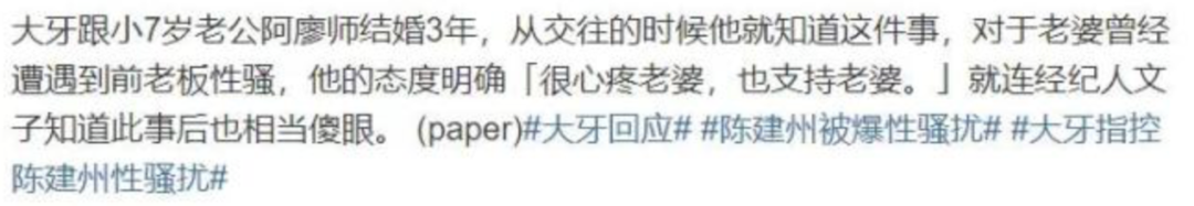 6月29号,前经纪人发文支持陈建州,斥责爆料女生蹭热度想红。