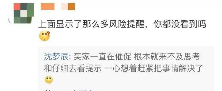 沈梦辰的答复是:买家一直在催促,根本就来不及思考和仔细去看提示, 一心想着赶紧把事情解决了。