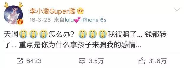李小璐就曾因好心想帮一个身患重病的儿童而受到诈骗,当时她收到一位网友的求助,称是一个两岁宝宝的妈妈,宝宝被诊断为神经母细胞瘤,后期至少还需要几十万元的治疗费用。