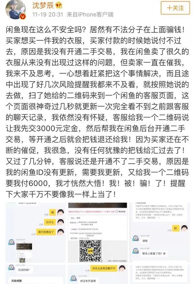 19号晚,沈梦辰在微博吐槽自已在二手平台卖衣服结果被不法分子骗了3000元。
