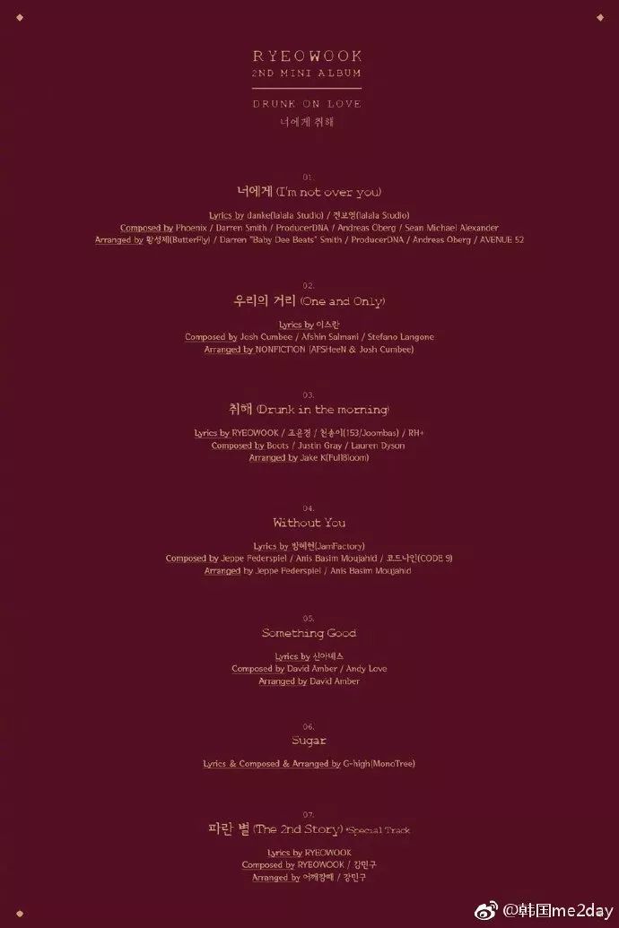 SuperJunior金厉旭迷你二辑《Drunk On Love》歌单公开!共计7首Track,主打曲为《I'm Not Over You》,特别是专辑中还收录了厉旭写给粉丝们的自作曲《The 2nd Story》。