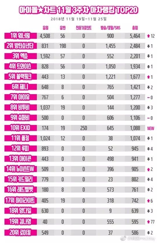 30日,据idol chart方面公开的11月第3周最新数据,WANNA ONE凭借音源4508分,专辑56分,SNS900分,总分5464分的成绩摘得了该榜单1位。位居亚军的是防弹少年团(总分2484分),之后依次为EXO(总分2201分),TWICE(总分1934分),BLACKPINK(总分1677分),JENNIE(总分1421分),IU(总分1277分),BTOB(总分1200分),Superbee(总分1106分),EXID(总分1088分)。
