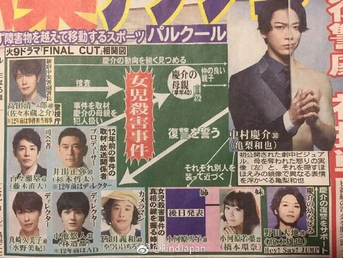 2018年1月富士台火9剧《FINAL CUT》,这是kame 2006年出演《恋爱补给品》以来时隔11年半单独初主演富士剧。桥本环奈、高木雄也、藤木直人、佐佐木蔵之介、林遣都、水野美纪、杉本哲太、やついいちろう等人共演。kame饰演的主人公中村庆介,在高中生的时候,母亲被当成杀害某女孩事件的犯人而自杀。12年后庆介找出真正的犯人开始复仇的故事。高木雄也饰演庆介青梅竹马的野田大地,桥本环奈饰演掌握事件真相的关键人物美人姐妹的妹妹小河原若葉,饰演姐姐的角色之后公开。