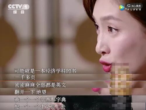 由于念的是传媒经济学,英语、数学和经济对于江疏影来说其实都是从零开始。面对1000多页的专业书,江疏影就像我们初学英语那样,一个个单词的查,一个个中文写上去,1000多页的书也成了1000多页的笔记。