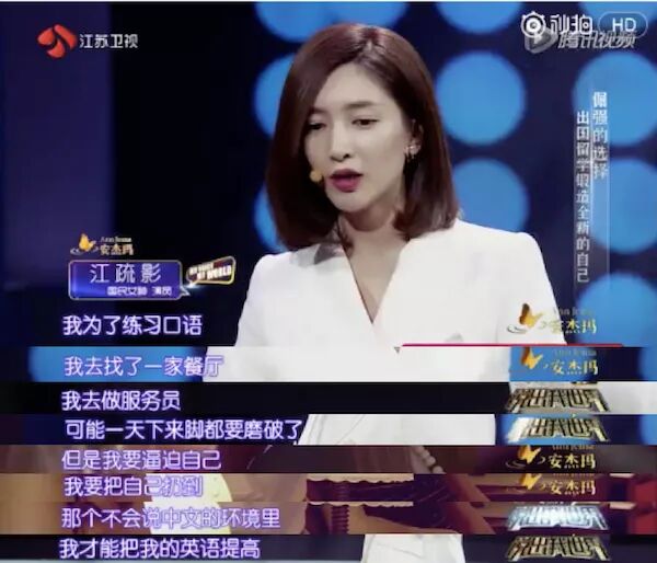 所以,江疏影的英语水平真的不是一朝一夕得来的,全靠着她在逆境里的那股叛逆劲,挑战不可能以及挑战自己。