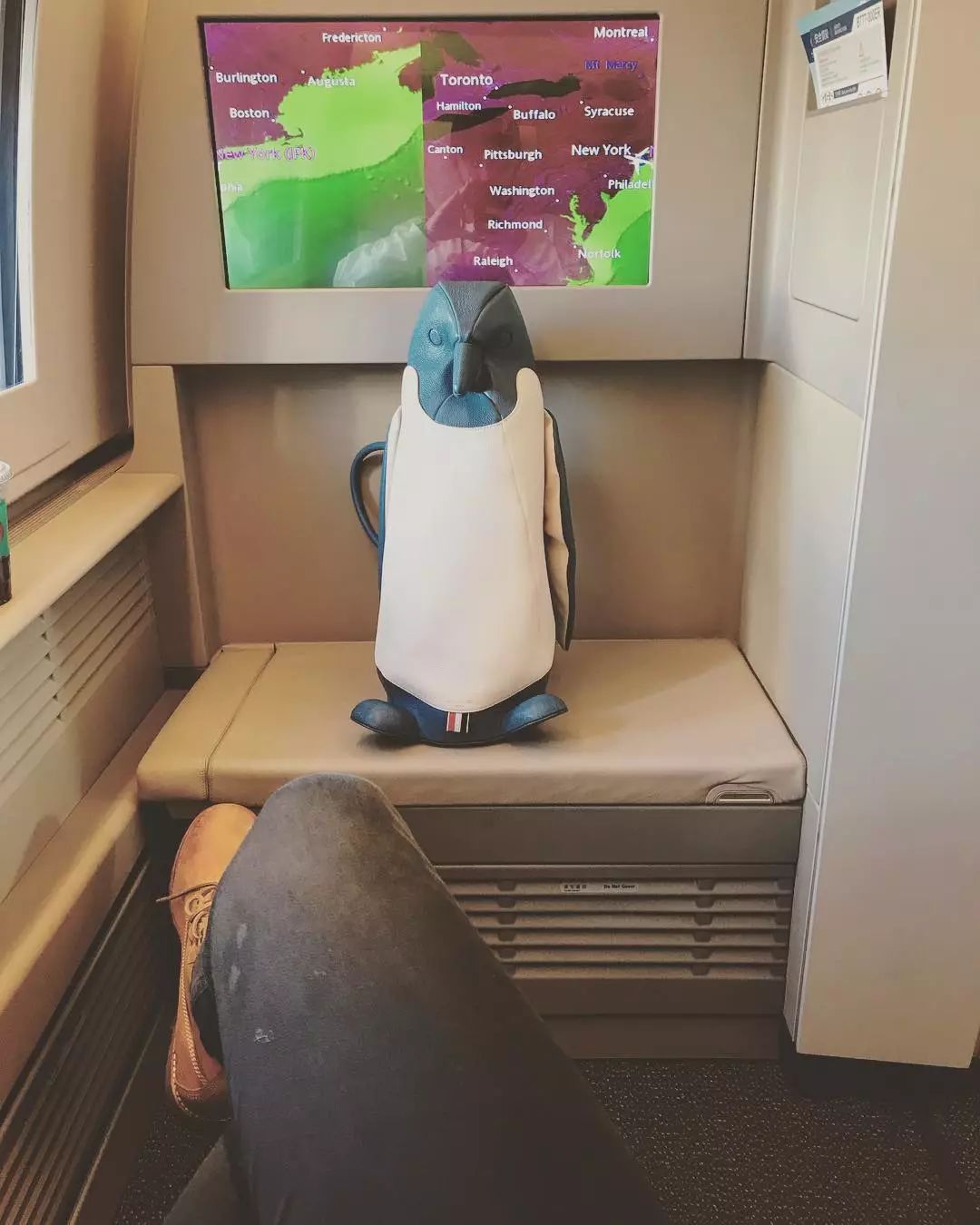 第二则INS:Save fly bro,配图起飞前,企鹅儿子乖乖坐在位置上……海浪太羡慕儿子了~
