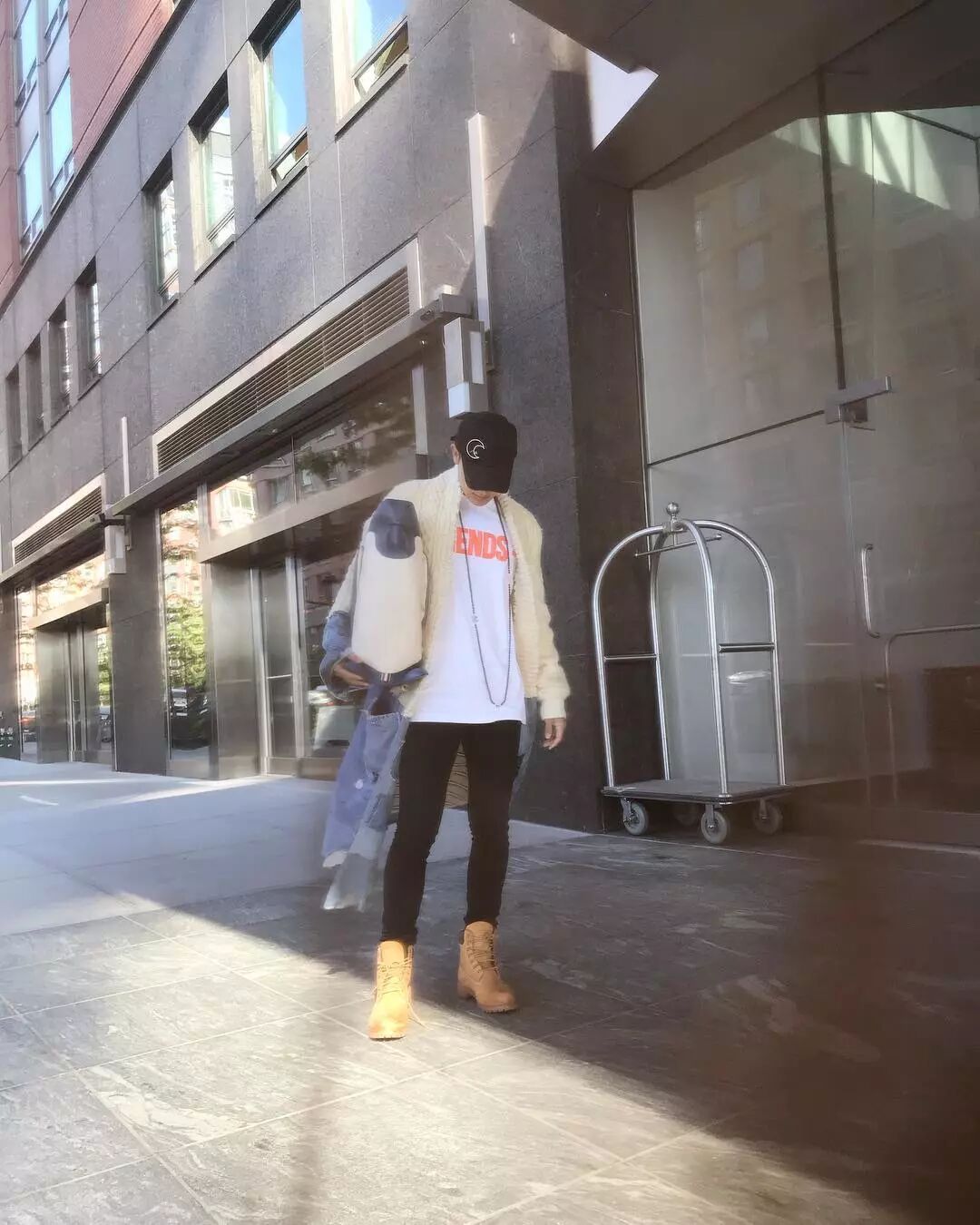 第一则INS:It's time to go home, 该回家了。韬哥抱着“企鹅”儿子站在大街上,晒出日常穿搭。