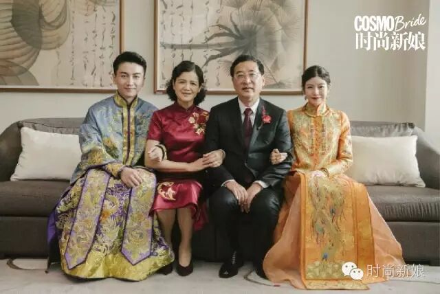 二陈的中式礼服均来自于玫瑰坊高级定制,陈妍希的中式礼服叫做橘色凤彩裙褂:制作工时要1880小时;面料是意大利缇花面料,金色凤纹刺绣,精美华丽,。陈晓的结婚礼服叫做瑞兽紫金袍:制作工时长达3985小时;面料为法国绸缎;礼服上绣瑞兽,龙纹刺绣,象征麒麟送子,富贵吉祥。