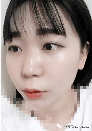 之前看,眼睛间距有点大,内眦皮过多,双眼皮此时应该已经有做过了吧,但是效果不是很好哈,再看被马赛克的鼻子,也能看出来是完全没山根,是个小塌鼻。