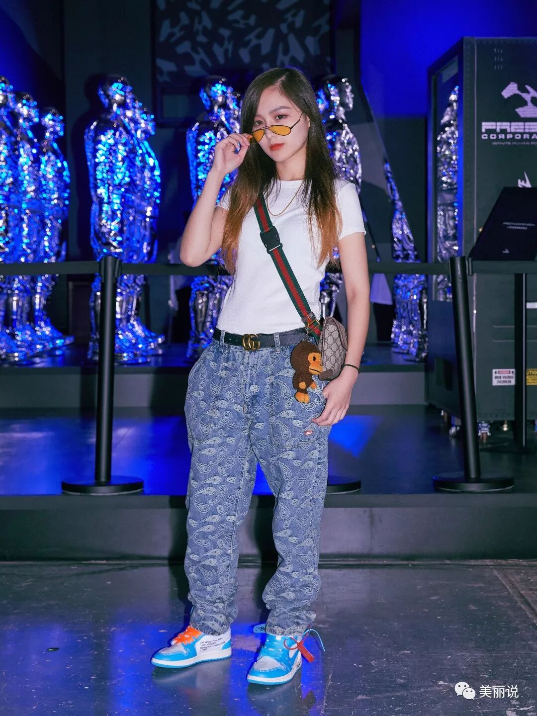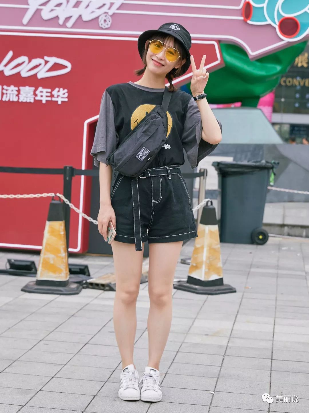 镭射光泽的pu腰包,与上衣同色的太阳镜,潮流就是用小配饰来增亮。