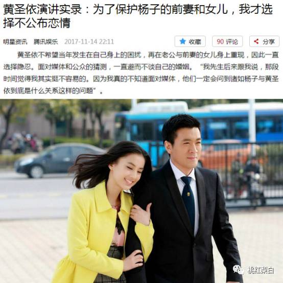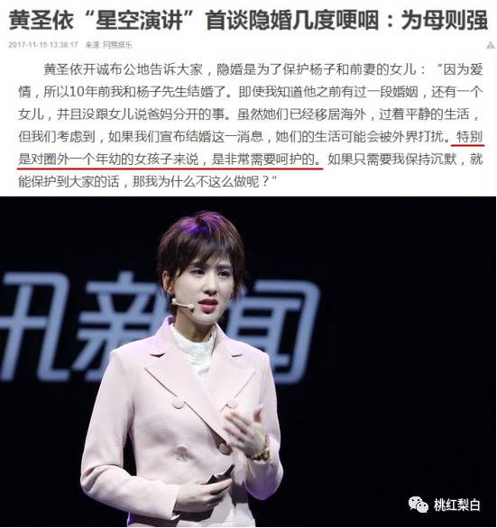 在星空演讲中,黄圣依说到,之所以隐婚十年,是因为杨子与前妻离异时,并没有告诉他们的孩子父母已经分开。
