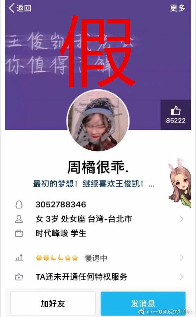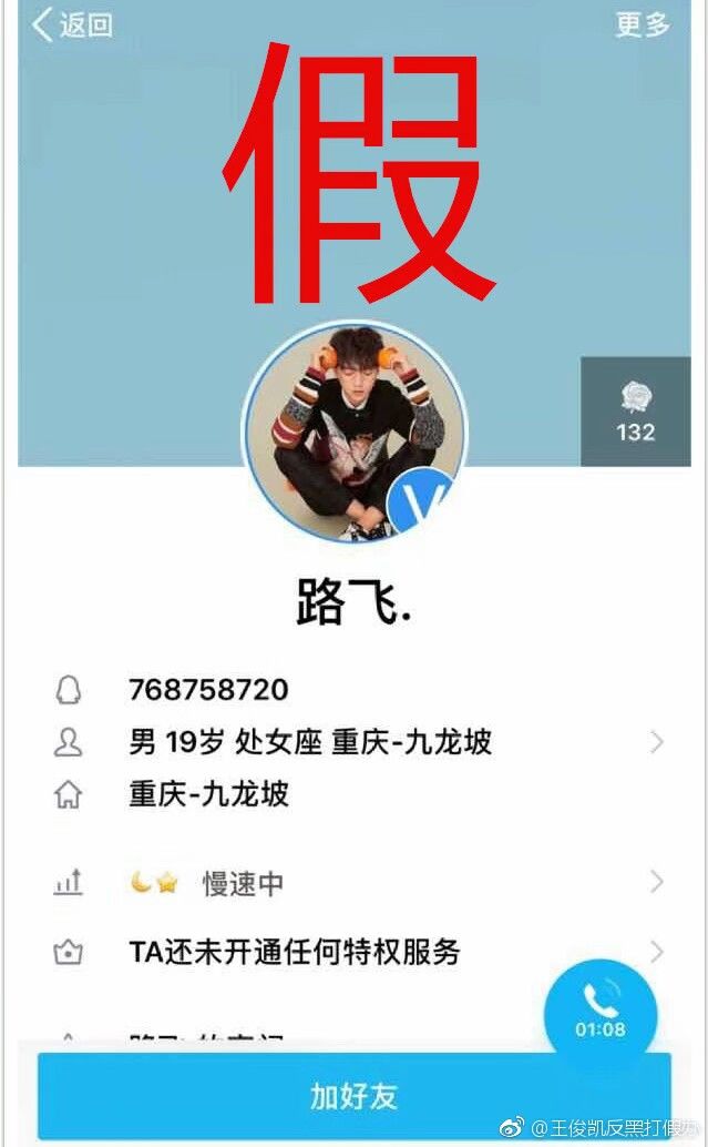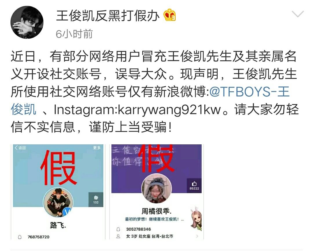 虽然现在社会,大部分粉丝还是一眼就能看出是假的,但还是有些粉丝不明真相,愿意去相信这些东西,所以还希望一些粉丝保持理智。不论是王俊凯的QQ号还是微信号,都是小凯私人的东西。粉丝不能以爱的名义去打扰私下的小凯。
