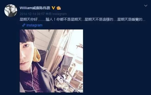 你是陈伟霆的「星期六」还是「星期天」 爱未停资源博 港台男星 2016-05-28 23:13:54 198 创作不易,用心坚持,欢迎请BaGua喝几杯爱心咖啡!打赏并支持本文 打赏并删除本文 陈伟霆的星期六是用来早起吃鸡蛋的而陈伟霆的星期天是用来睡…觉的那么你是星期六还是星期天呢明天就是星期天了呢小资源要早点休息了,GN~ 创作不易,用心坚持,欢迎请BaGua喝几杯爱心咖啡!打赏并支持本文 打赏并删除本文 感谢您的支持鼓励,我会继续努力的!文章地址:用户邮箱:打赏金额:USDT 请输入数字点击”去打赏“,即可进行打赏支持本文章哦 陈伟霆 About the Author 爱未停资源博 功能介绍:爱未停★陈伟霆资源博【非站子/非官方❤只为陈伟霆】微博:weibo.com/lovewilliamforever Related Posts 【INS】160703-陈伟霆更新INS 2016-07-03 21:34:13 距离陈伟霆主演《老九门》开播,还有一天! 2016-07-03 21:34:12 陈伟霆电影《爵迹》上海新闻发布会 2016-06-11 23:44:21 陈伟霆上海国际电影节与爵迹&疯狂小事剧组走红毯 2016-06-11 23:44:20 陈伟霆:踏实行走,遇见不一样的日月星辰 2016-06-05 20:24:15 发表评论