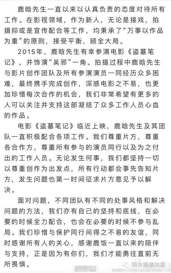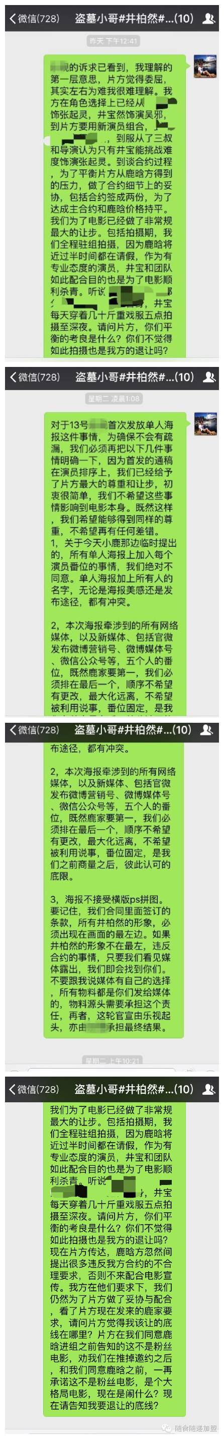 “但对于鹿晗那边临时提出,‘所有单人海报加入每个演员的番位’一事,我方绝不同意。(片方)一再承诺这不是粉丝电影,是个大格局电影,现在是闹什么?现在请告知我要退让的底线?”总之呢,就是表达不满。