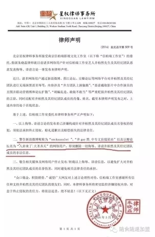 这次事件最早是从5月9日井柏然工作室发布的一条律师声明开始的。