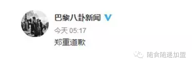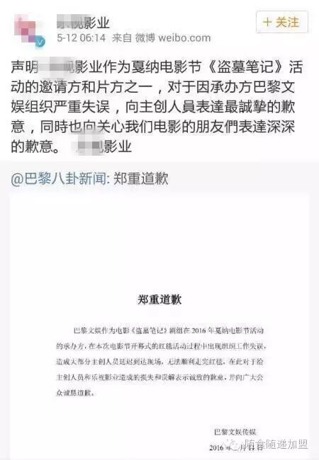 在种种看似不靠谱流言的传播中,一个名为@巴黎八卦新闻的微博账号在当地时间凌晨发布了一则题为《郑重道歉》的声明,称由于巴黎文娱的工作失误,导致大部分主创人员未能按时抵达现场。