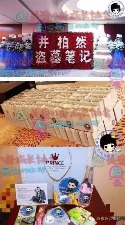 而另一头井柏然的粉丝肯定也不甘示弱啊,大到“盗墓笔记井柏然”的巨型花墙,小到贴有井柏然卡通头像的矿泉水、纸巾应有尽有!