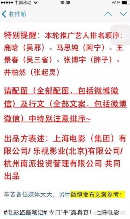 在片方发给媒体的通稿中,井柏然的名字也被放到了最后。