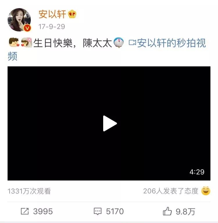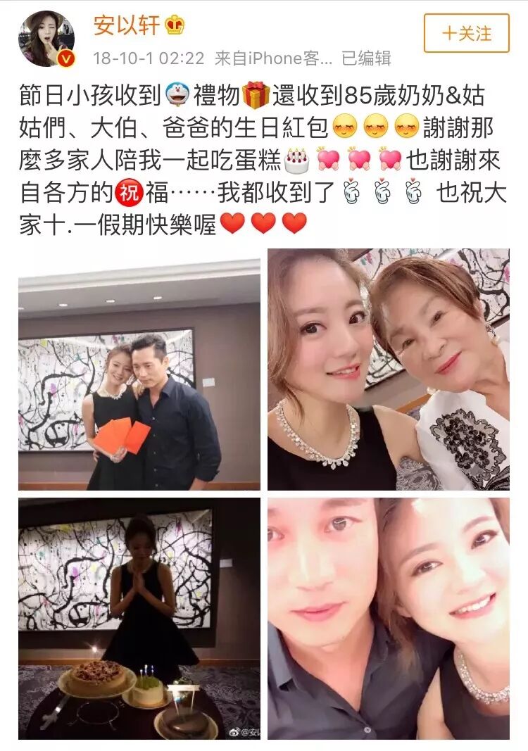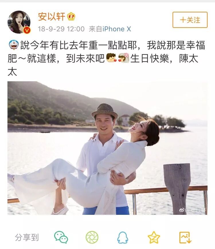 安以轩在微博写终于把这一天“变成一个节日”,看来真是被陈先生宠成了公主,生活永远需要节日,来增添惊喜与仪式感。