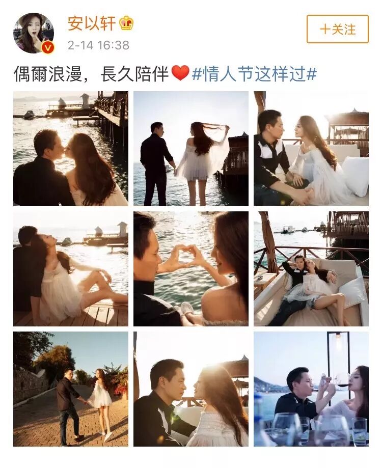 悉数她17年结婚之后的微博,不难看出安以轩是一个非常注重仪式感的人。十条里面至少八条有老公陈荣炼出镜,合照多是幼稚亲昵的大头照,就像一对普通蜜恋中的新婚夫妇,想不遗余力地大声向全世界宣告:我爱你。