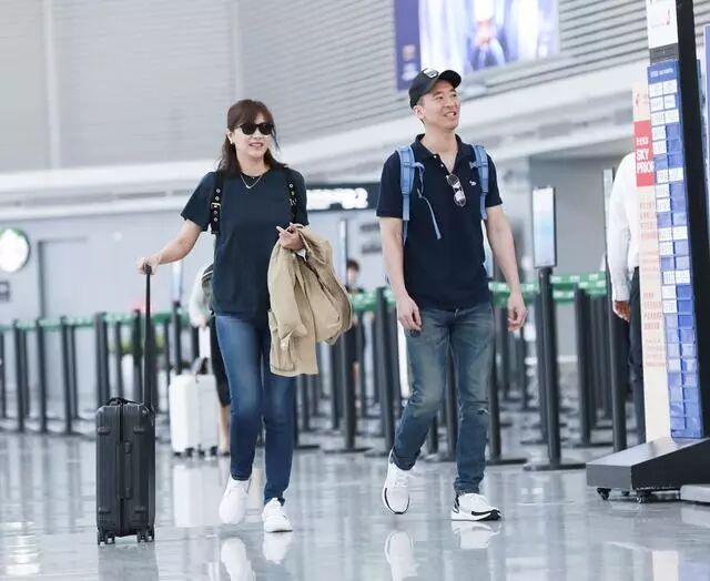 徐静蕾背着一个双肩包,像极了一个女学生,头发前面有着刘海,带着黑色的墨镜看上去酷酷的。左手拿着一件黄色的风衣,右手推着黑色的行李箱,和旁边的黄立行走在一起,有说有笑的。徐静蕾笑起来的时候,嘴巴弯成一个很温柔的弧度,看上去十分漂亮。