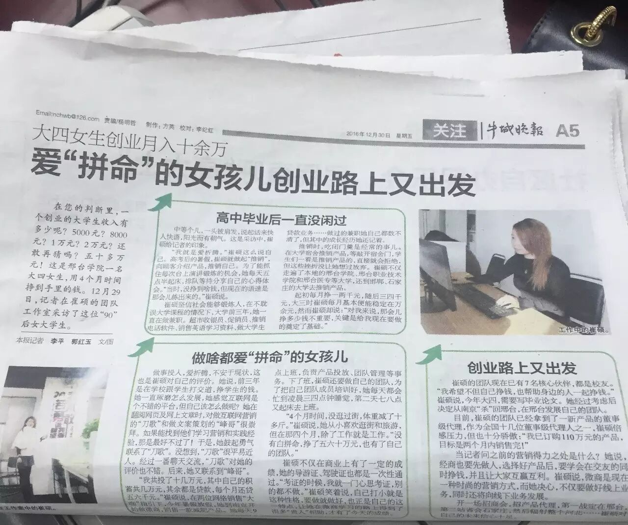 她叫崔硕,是邢台学院大四学生,现在已经组建百人团队,开了公司,月入10万,成为当地创业典范,邢台市团委书记大力表扬,<<牛城晚报>>连续报道。