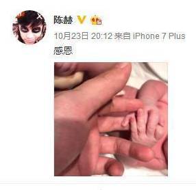 23日晚8时许,陈赫在微博晒出一张自己的手牵着新生儿小手的合照,并配文称“感恩”,证实其与张子萱的孩子已出生。经了解,张子萱是当天上午在上海顺产女儿,六斤六两,母女平安。网友纷纷在陈赫微博下方留言表示太突然,“我的天!什么情况!”“这进度也太快了吧!”同时也有很多网友祝福陈赫升级“奶爸”。