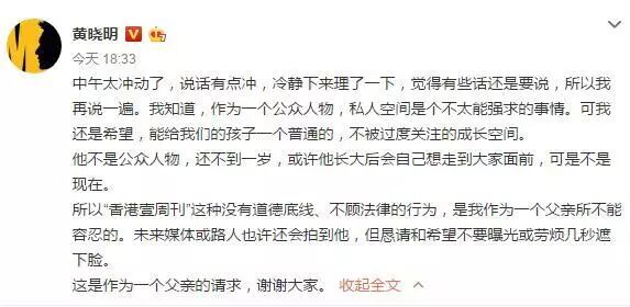 或许是觉得自己上面那番话太冲动了,今天傍晚,黄晓明又发了微博,称:“香港壹周刊”这种没有道德底线、不顾法律的行为,是我作为一个父亲所不能容忍的。未来媒体或路人也许还会拍到他,但恳请和希望不要曝光或劳烦几秒遮下脸。这是作为一个父亲的请求,谢谢大家。