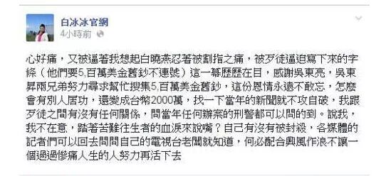 而这样的阵势也引起了媒体的注意,与警局有密切联系的主要媒体立刻获知消息。当晚就不停有记者打电话到白冰冰家里。白冰冰无助地哀告:“拜托,不要写,不要写,真的不要写。”