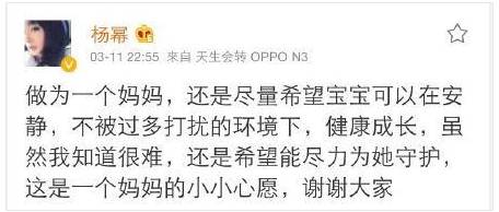 2015年3月,有媒体偷拍到刘恺威陪女儿小糯米现身香港某早教中心,对此,杨幂立即在微博中略带生气和懊恼的恳求网友能给女儿一个宽松的成长环境。