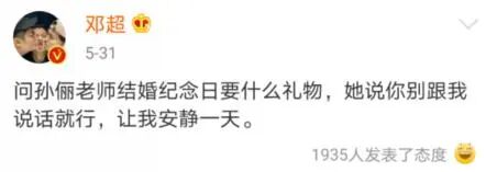 此前,邓超曾问孙俪想要什么结婚礼物,孙俪回答“你别跟我说话就行,让我安静一天。”家庭地位可见一斑