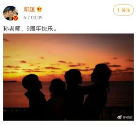 6月7日,@邓超 凌晨卡点发博,庆祝与孙俪结婚9周年:“孙老师,9周年快乐。”