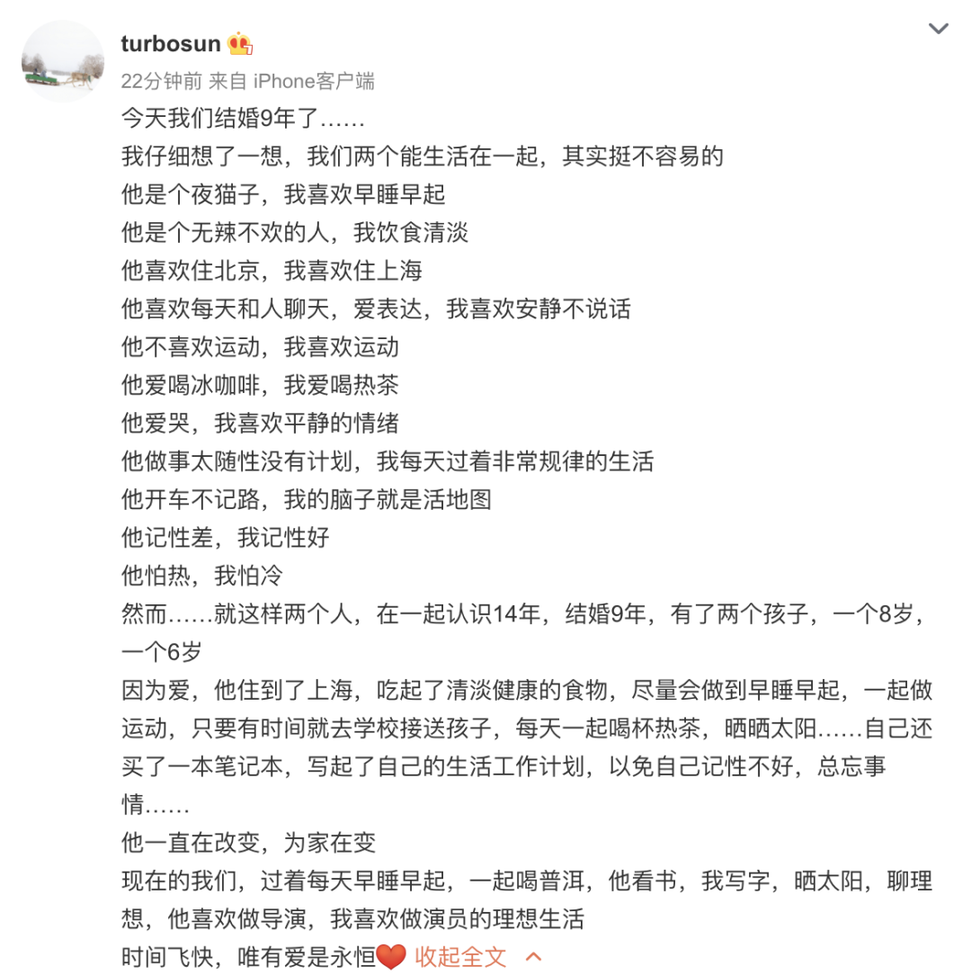 孙俪在文中表示,两人原本有很多不同的地方,“我仔细想了一想,我们两个能生活在一起,其实挺不容易的……”