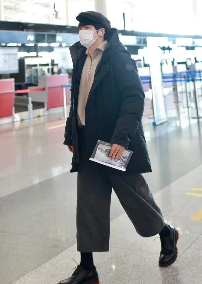 外套是黑色的派克羽绒服,可以说显得有点臃肿,可是他下身却选择了一条灰色的呢料阔腿裤,而且只有七八分的裤长。
