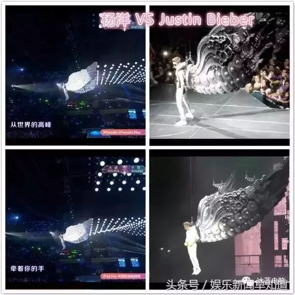 另外,杨洋的翅膀造型照搬自贾斯汀比伯的演唱会造型,白衣白翅膀吊威亚出场(好歹换个颜色啊,抄袭也不懂脑筋)。