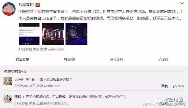 唐嫣罗晋张继科假唱什么的暂且不说,就说说天后王菲,东方卫视号称邀请到王菲,然而据现场观众爆料王菲根本就没有到现场,而是播放一段事先录制好的VCR,并且即使是录播,王菲唱的也很勉强,败笔中败笔啊。