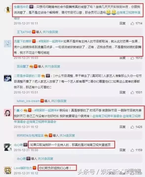 而湖南卫视网络会员直播,因为只有芒果会员才能在官网上看,并且会员本身数量有限。至于嘉宾呢,之前说好的杨洋、黄子韬、胡彦斌都临时退场,而直播现场节目还临时调整拿掉9个节目,吴昕跟鞠婧祎合演的节目删掉的事情更直接上了热搜的第一位。