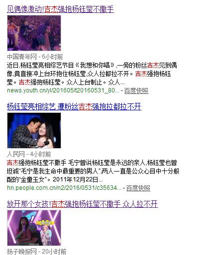 百度搜索吉杰的新闻,除了这个“强抱”的之外,最近一个还停留在今年一月~而且即便是出了这么大的事儿,很多媒体在做报道时都没有把他的名字放进标题,反而用男嘉宾、男粉丝来称呼~这样看来还真是有些心酸呢~