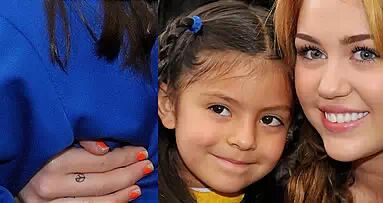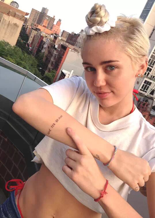 意义: Miley 是一个虔诚的基督教徒,和家人始终保持亲密无间的关系。她的父母也有一模一样的心形纹身图案,而那时她也深爱着她当时的男友 Liam Hemsworth,虽然我们无法确认她这个纹身是否也在向男友示爱,但是毫无疑问的是,Miley 深信,所有的爱皆平等。