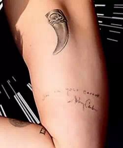 意义:Miley 非常爱动物,所有粉丝都知道她不忍心和自己的宠物分别。这条宠物鱼不幸去世,让她非常难过。她在推特上表示:我讨厌离别,为了永远记住它,Miley 把这条宠物鱼纹在自己身上。