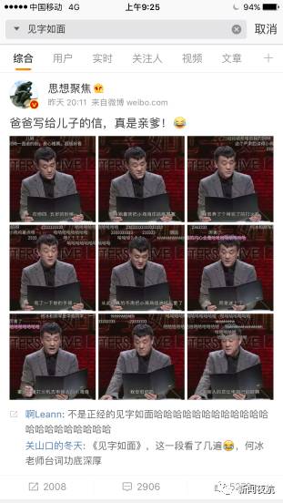 《见字如面》已播出七集,截止昨天,节目相关视频总点击量已达1.45亿。其中,单期相关视频最高点击量超过9563.4万。