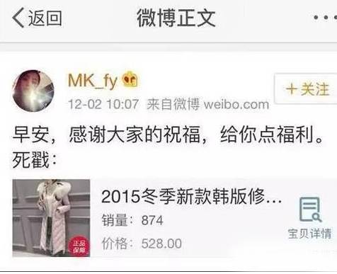 当然,方媛也不是傻子,她为什么心甘情愿地投入到这场不对等的爱情中来呢?好处也是显而易见的,成为天王嫂之前,她离一线网红还差得远,知名度并不算高,成为天王嫂后,人气急升。方媛很会把握时机,顺势就开始大推特推自己的网店。