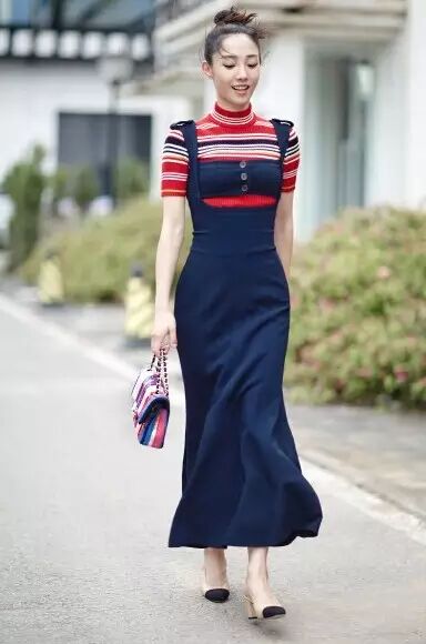 还有这种背带裙,也是减龄的单品,到脚踝的长度和收腰的设计,显身材又能突出长腿,腿粗的妹纸可以考虑~