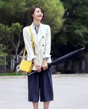 白色外套搭配7分阔腿裤+衬衫,干练简约,黄色的包包更是让整体增加一个时尚度。