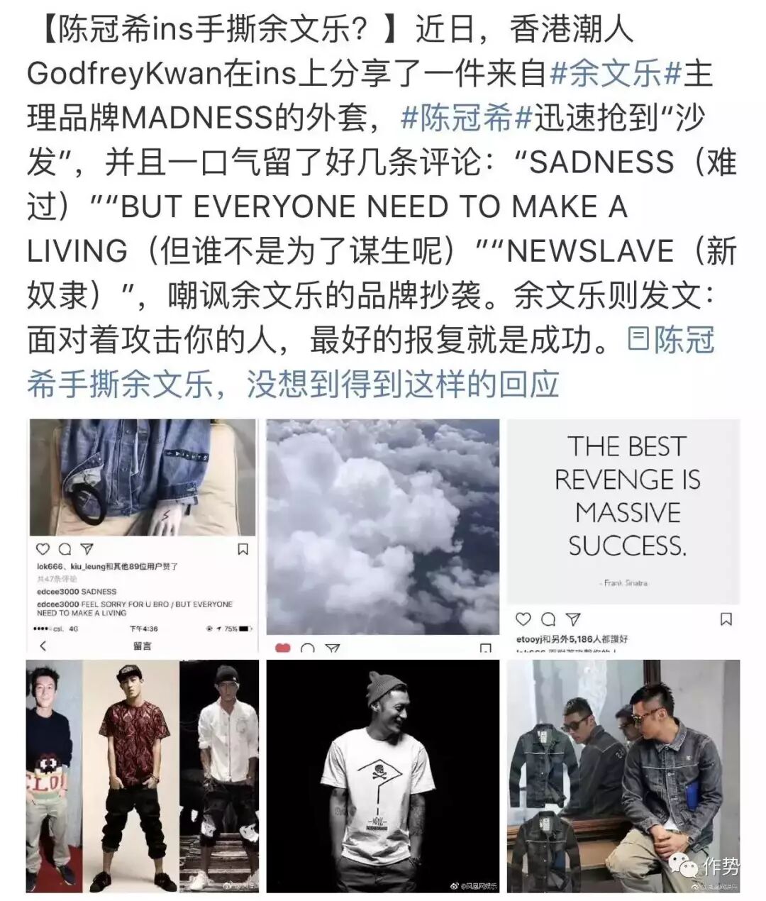 去年两人在INS上又双叒撕了一架,气势一点也不输给女明星撕B,前段时间陈冠希还表示和余文乐冰释前嫌,自己已经长大了,见面也不会尴尬,甚至可以合作,如今就又说余文乐潮牌抄袭撕了起来,令人琢磨不透。