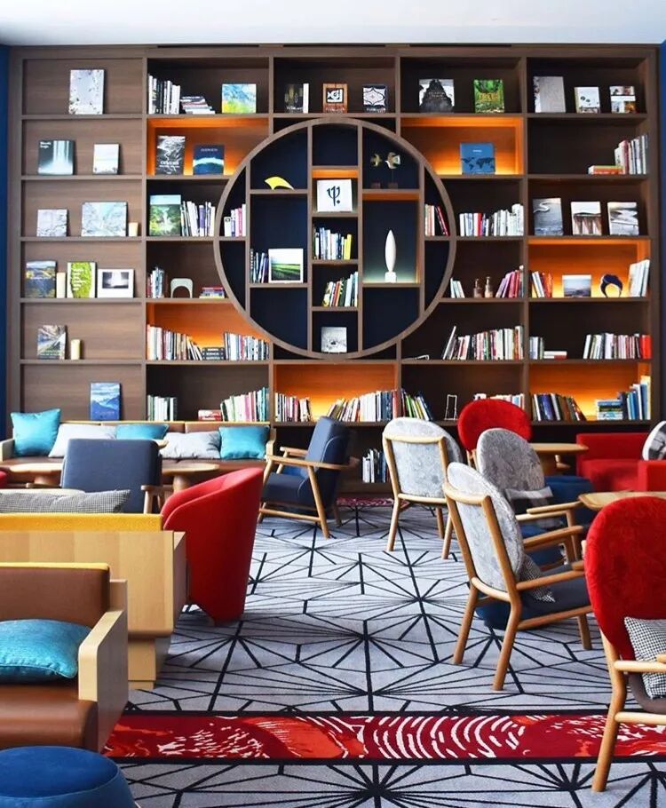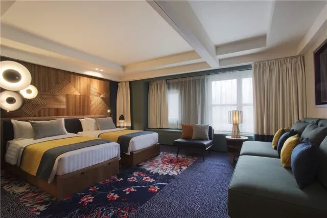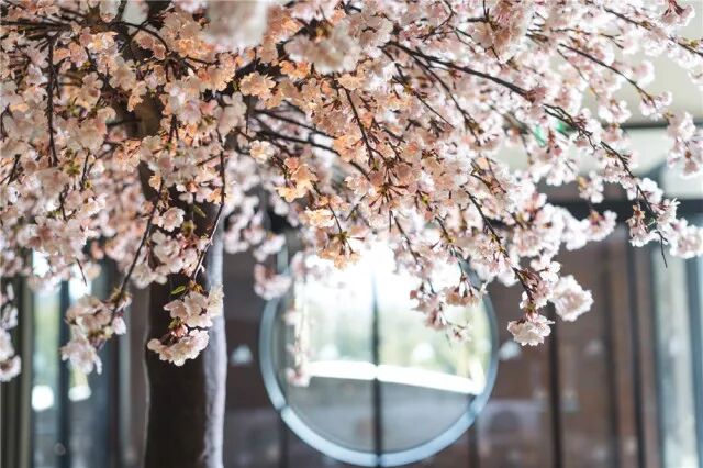 Lobby有一颗硕大的粉色樱花树,圆顶以倒影的方式呈现出水中映像,美艳且富有生命力。围绕着樱花树是一圈流线型的沙发区域,Checkin休息期间,服务员会递上一杯欢迎香槟,令你顿时感受到浓郁的度假氛围。靠垫、茶几、沙发凳以冷灰色系的蓝、粉、红相间,其中也有日式风格图案的融合,显得非常柔和优雅。
