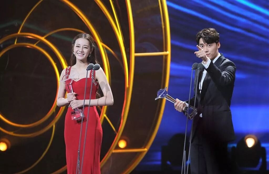 迪丽热巴和李易峰还获得了“最具人气演员奖”的水晶杯。